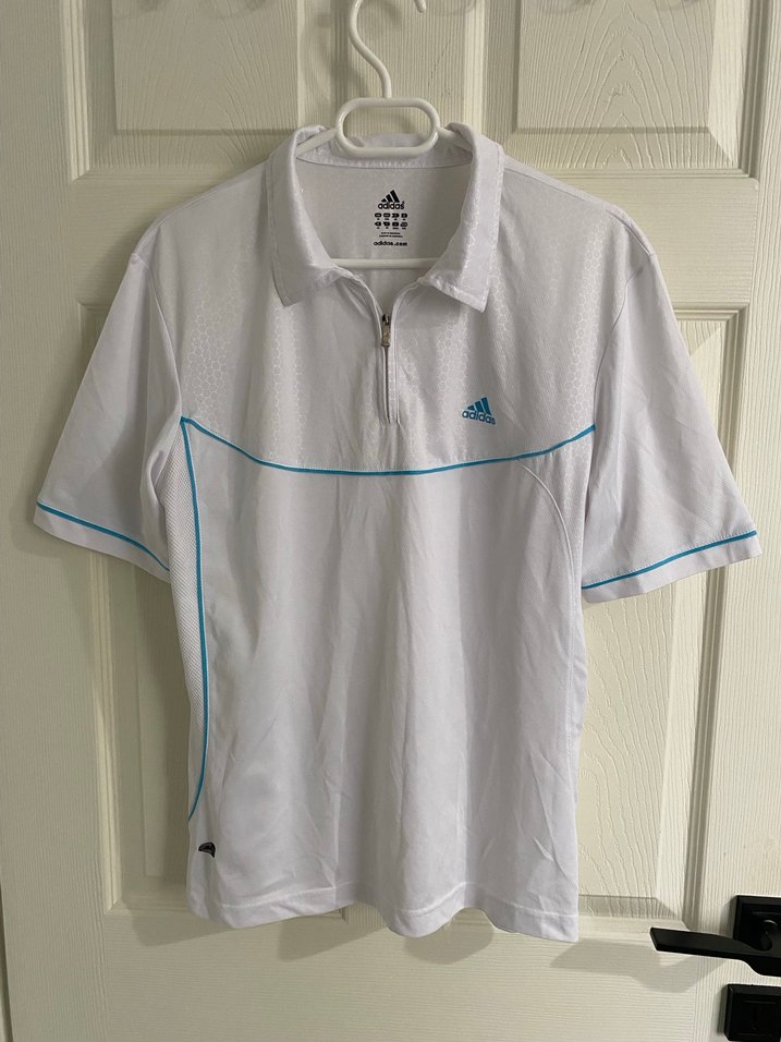 Beyaz fermuarlı tenis tişörtü, kısa kollu ve fitted kesimlidir. Hafif sentetik kumaşlı, mavi ince çizgilerle sade ve şık bir günlük spor stil sunar.