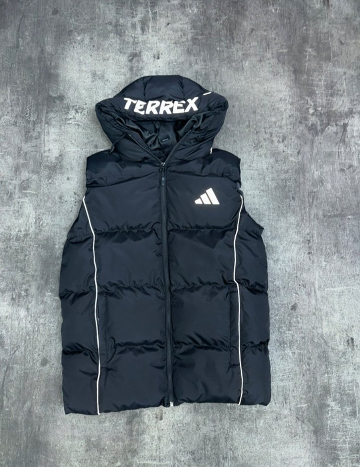 Her bedeni mevcuttur Adidas Terrex siyah kapüşonlu, kolsuz erkek yelek. Yüksek yakalı ve kürk detaylı, vücuda oturan kesime sahiptir. Outdoor kullanıma uygundur.