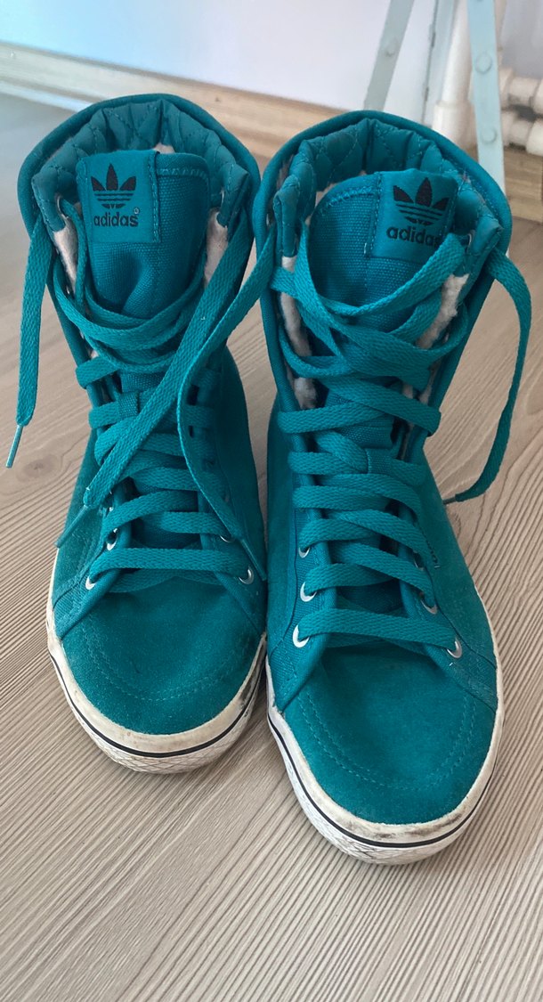Adidas marka, turkuaz renkte, süet malzemeden üretilmiş, bağcıklı ve topuksuz kadın spor ayakkabısıdır.