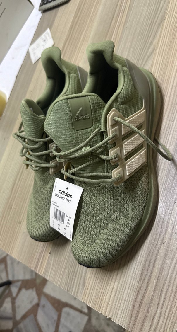 adidas UBOUNCE DNA erkek spor ayakkabılar, gri-yeşil bağcıklar ve nefes alabilir örme üst yüzeyle konfor sağlar. BOUNCE destek sistemi içerir.
