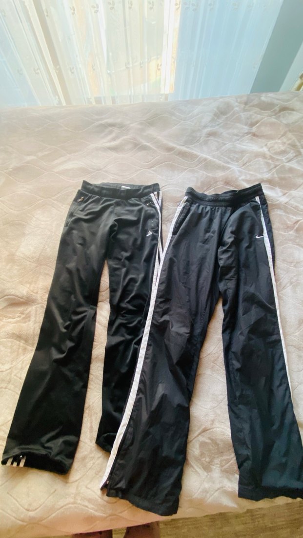 siyah, elastik bel bantlı, beyaz yan şeritli, sentetik kumaştan üretilmiş dar kesim eşofman altı. Tamamen orijinaldir, ikisini birlikte satıyorum,Adidas paçası ayarlanabilir,Nike ise paçası fermuarlı