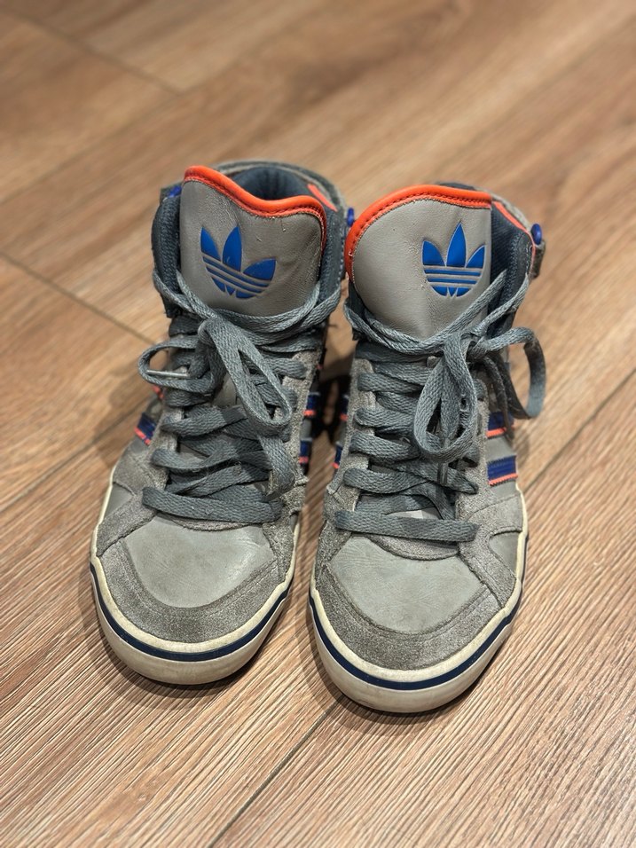 Canlı mavi logo ve yüksek bilek tasarımı bulunur. Vintage Adidas Bilekli Spor Ayakkabı