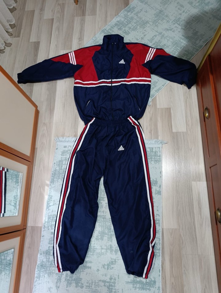 Lacivert ve kırmızı renklerde, beyaz şerit detaylı, sentetik kumaştan yapılmış, fitted kesim erkek eşofman takımı. Hiçbir yerinde sökük aşınma vb. sorun yok temizdir.