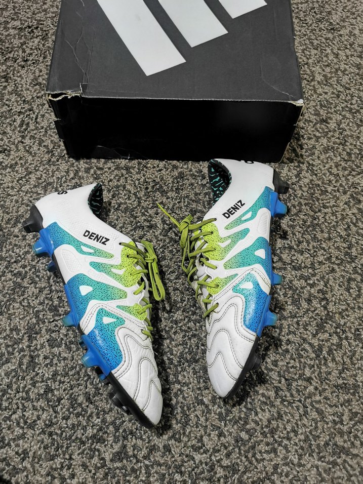 Beyaz renkli, renkli baskılı desenlere sahip, spor için kauçuk malzemeden yapılmış erkek futbol ayakkabısı. Velcro detaylı, trend sokak stili. ⚽ Sadece derisinde tahriş mevcut oda zaten deri olduğu icin olur fotoğraflarda belirttim