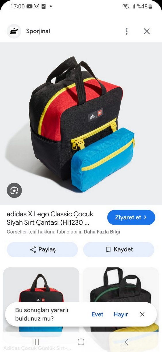 adidas X Lego Classic çocuk sırt çantası, kırmızı üst, siyah gövde ve çıkarılabilir sarı fermuarlı mavi cüzdan ile çok renkli koyu tasarıma sahiptir.