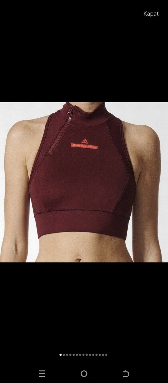 Bordo renkli, kısa kesim, yarım fermuarlı spor sütyeni. Üzerinde baskılı logo bulunur, athleisure ve streetwear tarzını yansıtır. orijinal xs adidas x stella mccartney 34 beden tül detaylı fermuarlı halter yaka