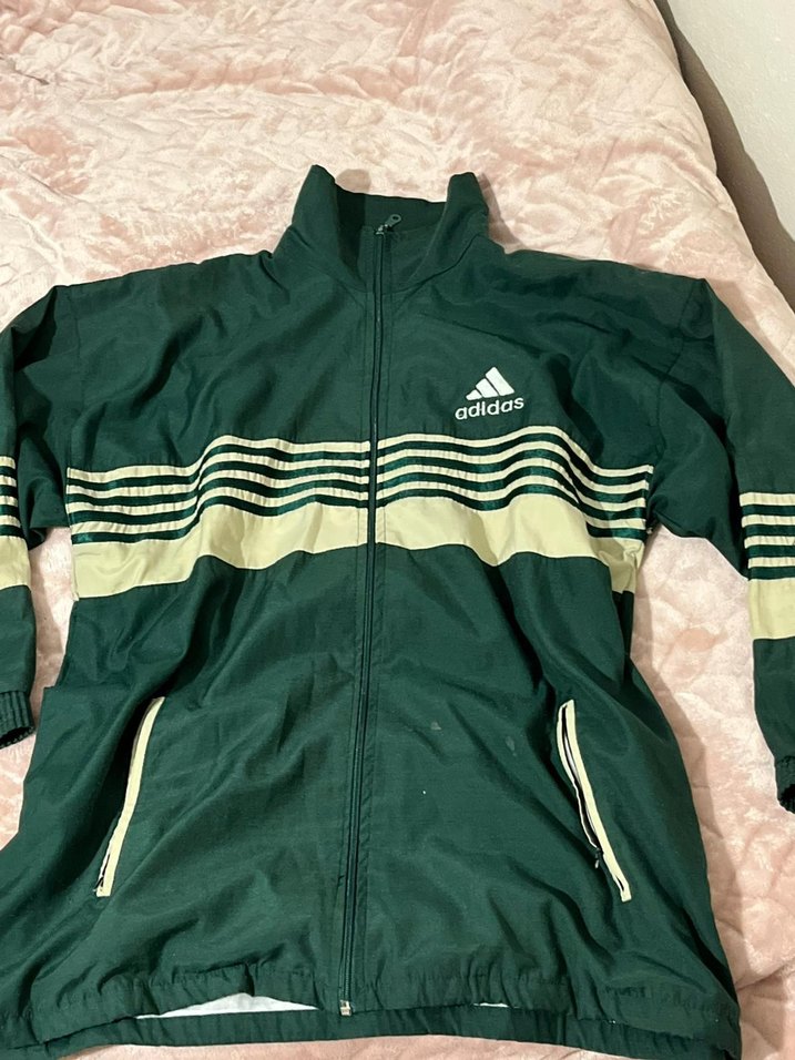 adidas erkek mont, yüksek yaka ve uzun kollu, yumuşak fleece kumaştan. Koyu yeşil ve krem çizgili, fermuarlı ceplidir, dış mekan ve sokak stili için uygun.