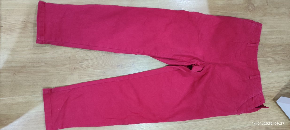 yandan Düğmeli, midi boy, kırmızı kadın denim pantolon. pamuklu ve likralı kumaştan, sade ve renkli, günlük kullanıma uygun.