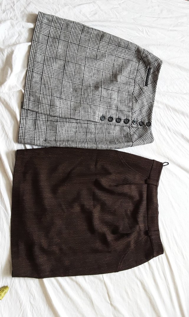 Afil ışık gri kareli ve kahverengi midi etek. Gri olan yandan yırtmaçlı yıkanmalatı gerekiyor