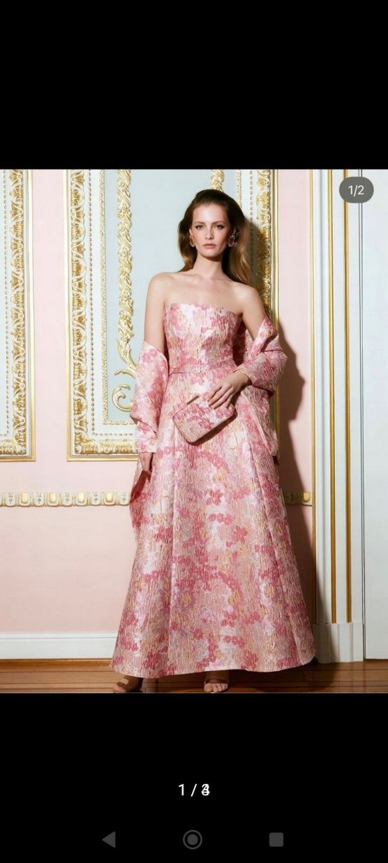 Pembe straplez, çiçek desenli uzun abiye elbise. Bir defa giyildi.