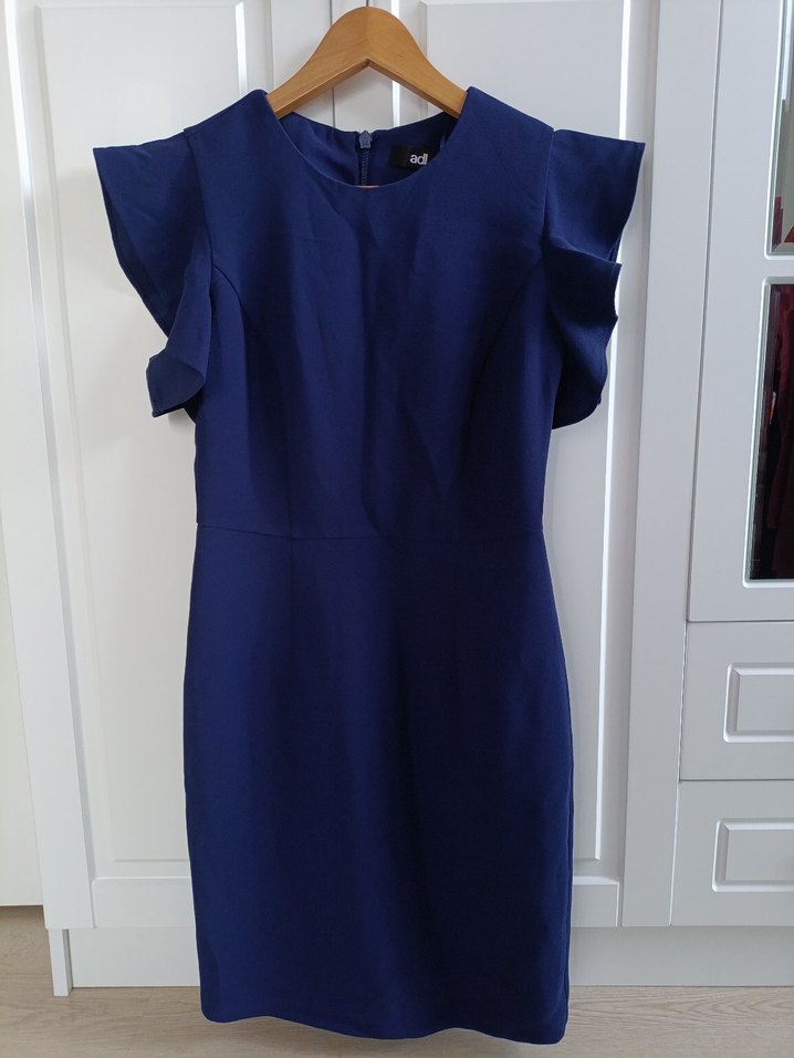 Orjinal Adil Işık - adL markalı lacivert şık elbise. Hiç kullanılmamıştır. Herhangi bir sorunu yoktur. Ofis ve şık ortamlar için uygundur. Kollarında şık fırfır detayları vardır. Elbisenin uzunluğu 90 cm , beli 35 cm'dir. M-38 bedendir.