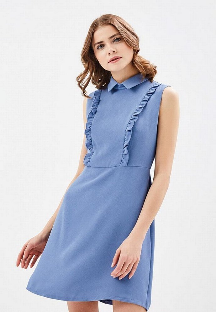 Düğmeli yakalı, kolsuz mavi midi elbise. Yumuşak sentetik kumaştan, normal kesim ve fırfır detaylıdır. Ofis için uygundur.