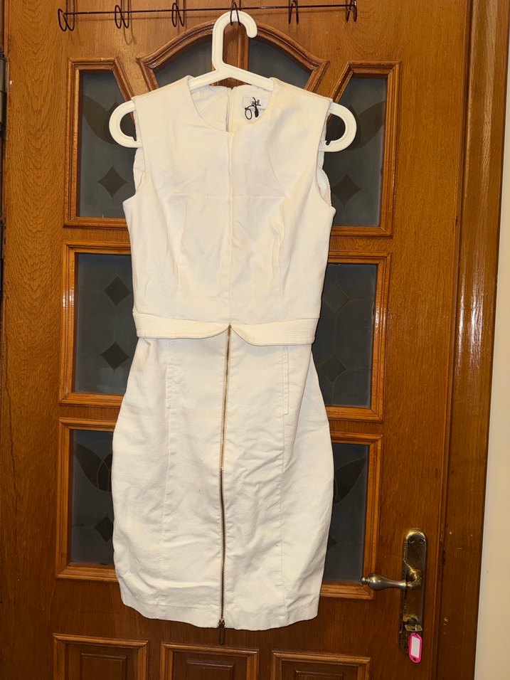 Düz beyaz, kolsuz ve oturan kesim midi elbise. Notlu yaka ve önden fermuar detayı bulunur. Sentetik kumaştan üretilmiştir. S ye de uyar yapısı sarıcı ve esnek cünkü