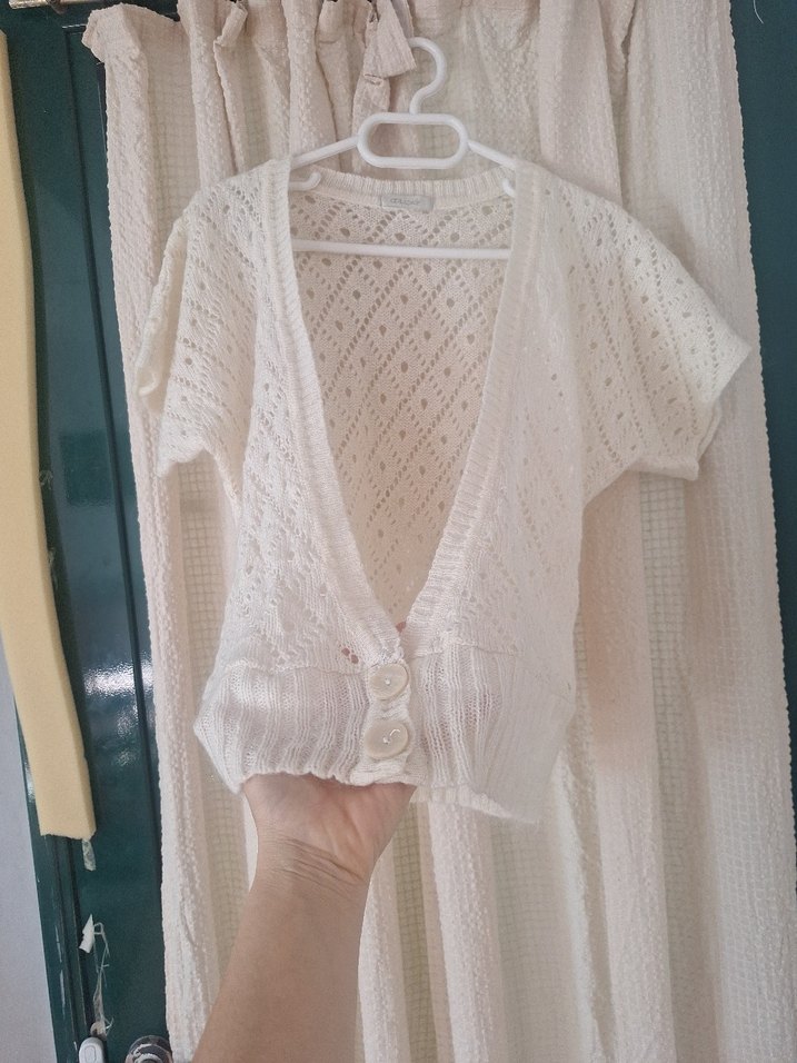 Beyaz örgü bohem hırka, V yaka ve kısa kolludur. Rahat kesimi ve midi boyuyla günlük kullanıma uygundur. ADİL IŞIK S BEDEN Yünlü hirka askıda asılı iken iki kol arasi yaklaşık 60 cm kadar esner omuzdan bel bitimi yaklaşık 56 cm dir düğmeleri açılabilir