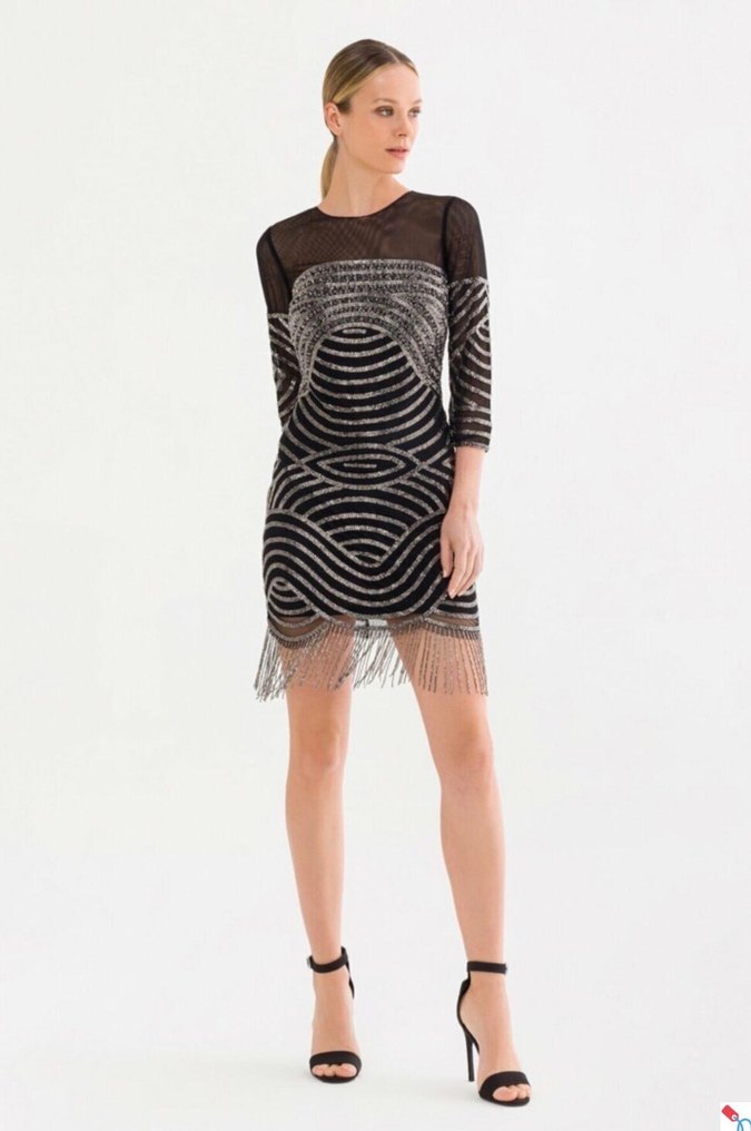 Boncuk işlemeli, zebra desenli siyah ve gri mini abiye elbise. Yuvarlak yaka ve üç çeyrek kollu, etek ucu püsküllü, parti için uygun. ✨