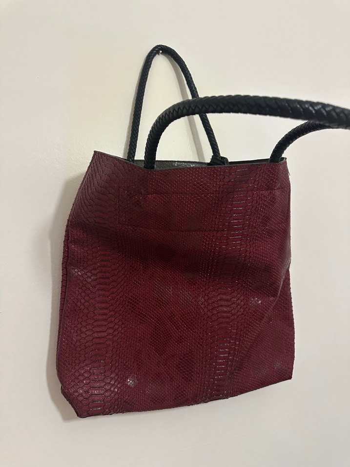 Adik ışık Bordo dokulu, yılan desenli kadın çantası. Fermuarlı ve siyah saplı, günlük kullanım için minimalist ve çağdaş tarzda.İç fermuarlı kopuk ama açık da kullanılabilir.