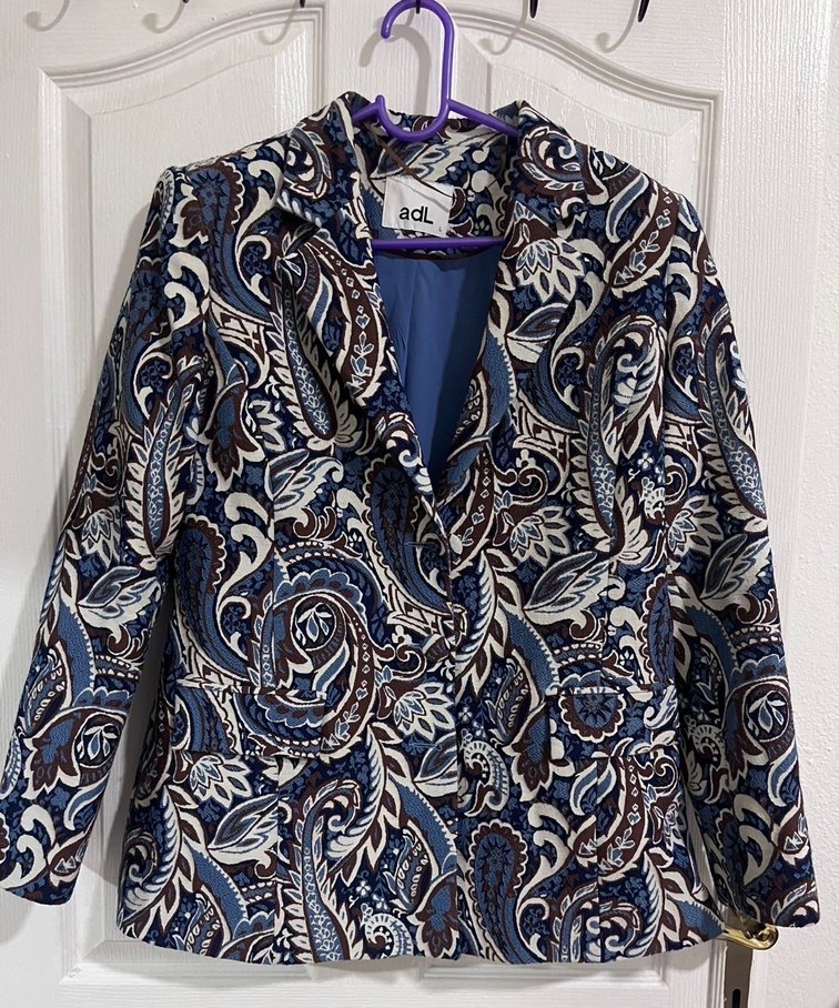 Bohem tarzda, koyu mavi yılan desenli, düğmeli kısa kadın ceketi. Uzun kollu, regular fit ve sentetik kumaştan, ofis kullanımı için uygundur.