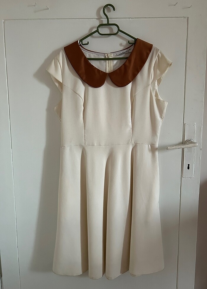 Bebe yaka tok kumaşlı krem rengi elbise. Yakası saten ve taba rengi. Hanım hanımcık bir duruşu var. Adil Işık’tan almıştım. Bir kere davette giyildi