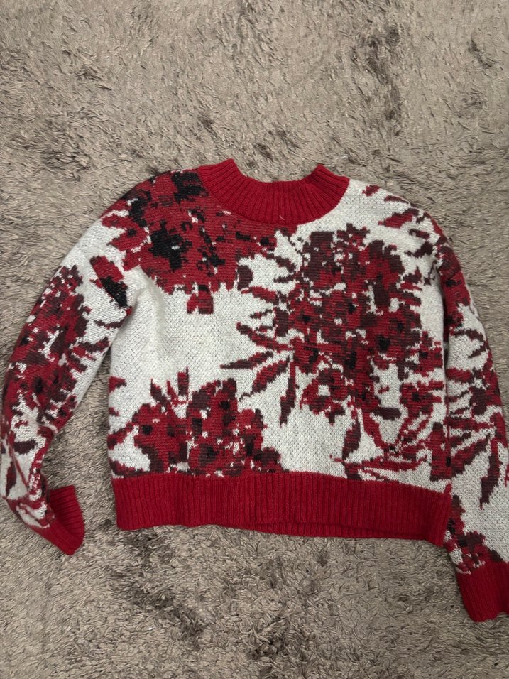 Kırmızı ve gri tonlarda desenli, uzun kollu, yuvarlak yaka, bol kesim örgü kadın kazak. Rahat ve bohem tarzda bir parça.