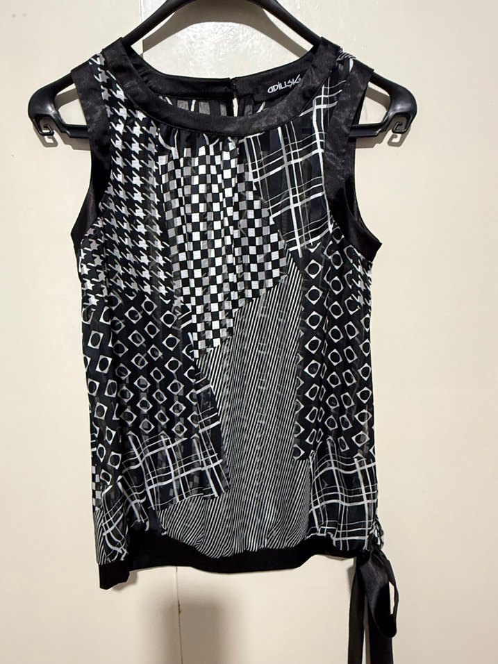 Siyah, desenli tekstil kumaştan, kısa boylu, halter yaka ve kolsuz, bol kesim bluz. Yanında kurdelalı bağlama detay bulunur, hem gece hem günlük kullanıma uygun