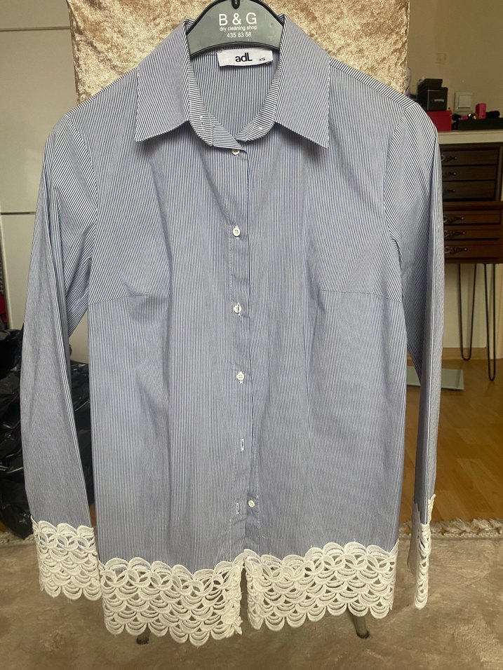 Düğmeli, uzun kollu mavi pamuklu gömlek. Bohem tarzda, yakalı ve normal kesim. Etek ve kol uçlarında dantel detayları bulunur.