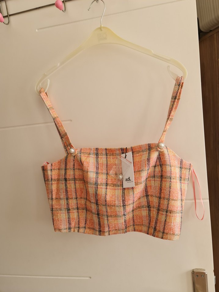 Kadınlar için düğmeli, ince askılı, pastel pembe kareli kısa crop top. Sentetik kumaştan, straplez ve dar kesimdir.