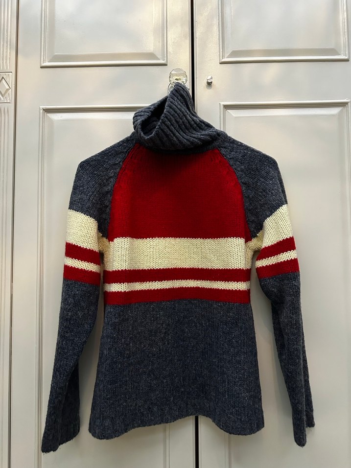 Yün kumaştan, boğazlı ve uzun kollu, gri taban üzerine kırmızı ve krem şeritli, rahat ve fitted kesim kadın kazak.