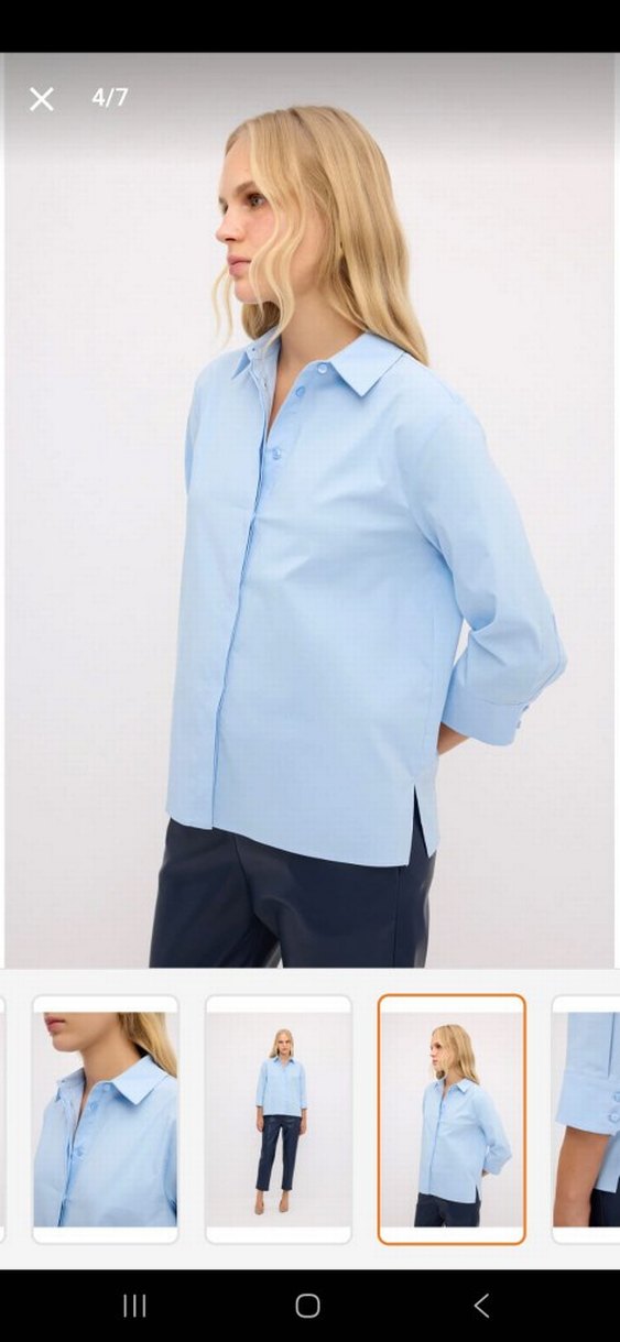 Mavi, uzun kollu, düğmeli ve V yakalı ipek dokulu gömlek, normal kesim ve minimalist normcore tarzıyla ofis için uygundur.