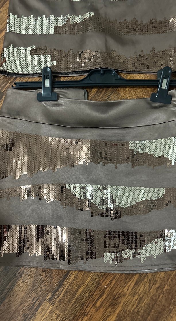 Kahverengi pul detaylı desenli, sentetik kumaştan yapılmış, dar kesim mini etek ve straplez üst takım davetler ve partiler için uygun.