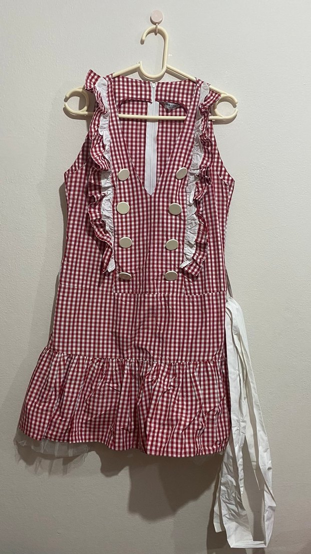 Adil Işık Kareli kırmızı beyaz renkli, volan detaylı, kolsuz mini elbise. Düğme süslemeleriyle günlük şık tarzına uygun, rahat kesim. M bedendir.
