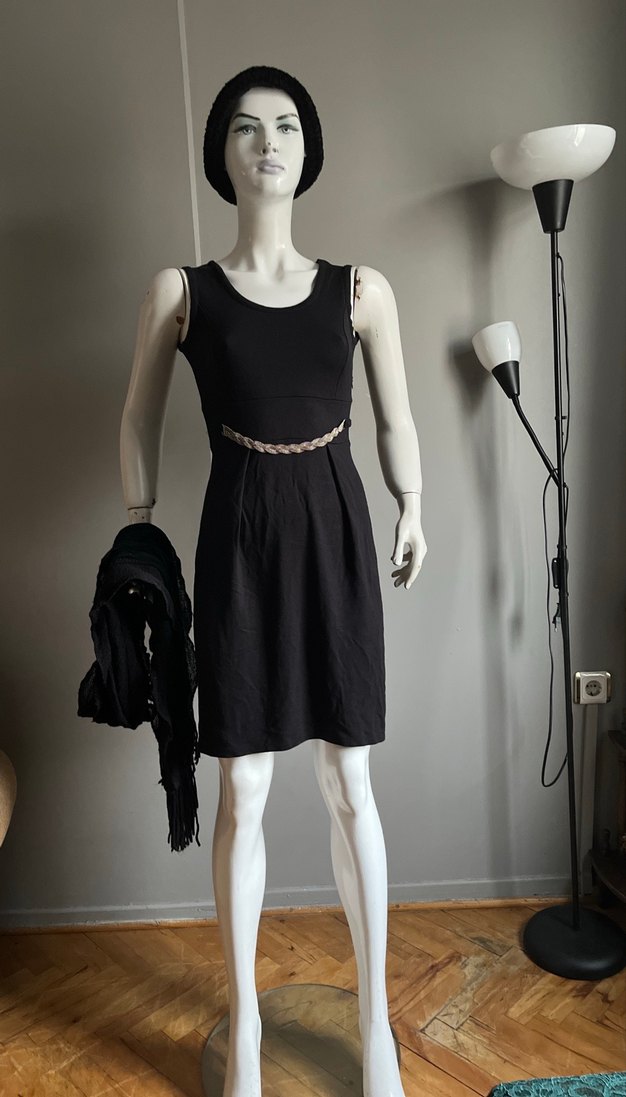 Kolsuz, siyah mini elbise, kemerli ve regular fit kesimlidir. Minimalist goth tarzı için uygundur, straplez yaka ile şık bir görünüm sunar.
