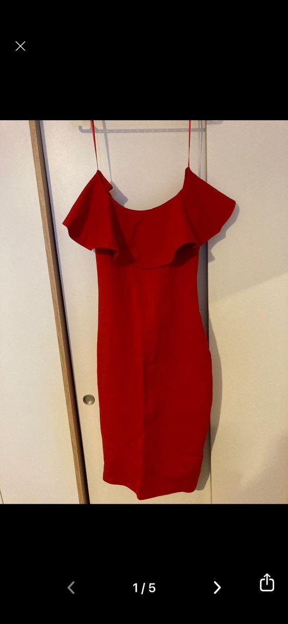 Parlak kırmızı renkli ve volan detaylı, vücuda oturan midi boy elbise. Straplez degildir madonna yaka, tam diz alti. Bir kez giydim, kumasi inanilmaz kaliteli, hicbir deformesi yok yeni gibi
