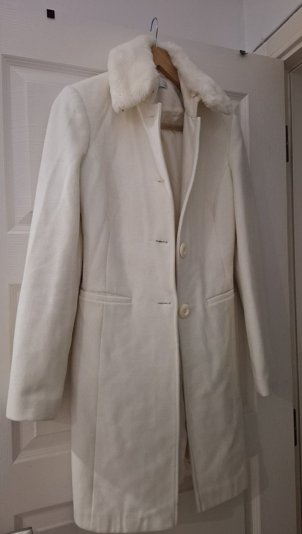 Yumuşak ve sıcak kumaştan yapılmış, kürk detaylı yakalı, düğmeli beyaz kaban. Yan ceplidir. ❄️