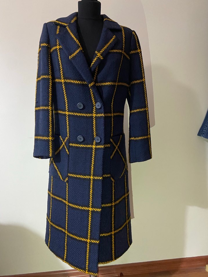 Düğmeli ön kısmı, ekoseli deseni ve kesilmiş yaka detaylarıyla uzun lacivert palto