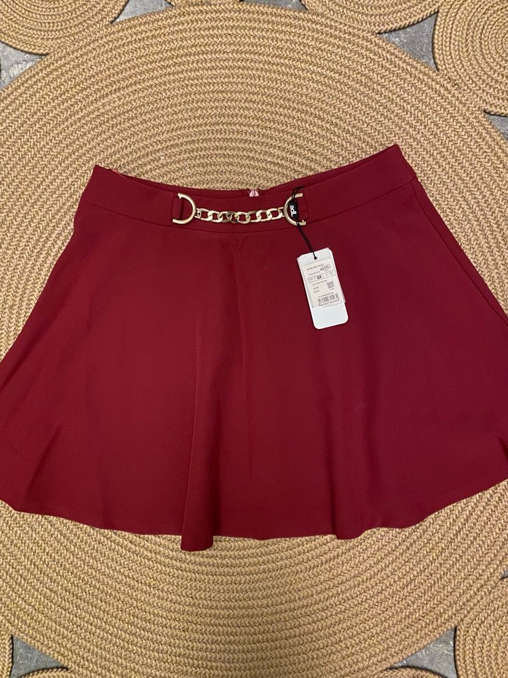 Sentetik kumaştan, kemerli, parlak bordo renkli, kiloş kesim mini etek. Günlük ve sokak stiline uygun.