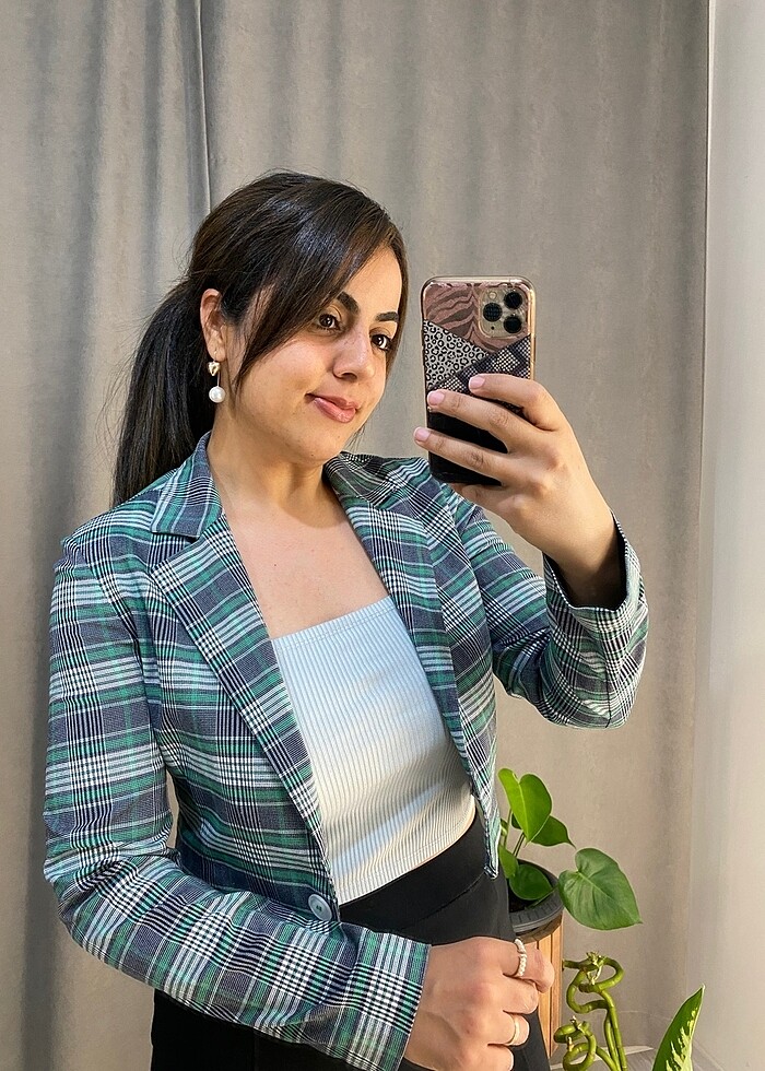 Gri yeşil çizgili önü düğmeli crop vatkalı ceket uzun kollu blazer tarz ve modern bir ceket. Klasik kesimi ve zarif tarzıyla her yaşa her döneme hitap edebilecek şahane bir parçadır. Hem günlük hayatta hem de ofis ortamında stil sahibi ve kararlı bir duruş yakalayabilirsiniz . Boyu 40 cm iki koltuk altı arası 45 cm’dir. Tercihen XS-S bedenler tercih edebilir.