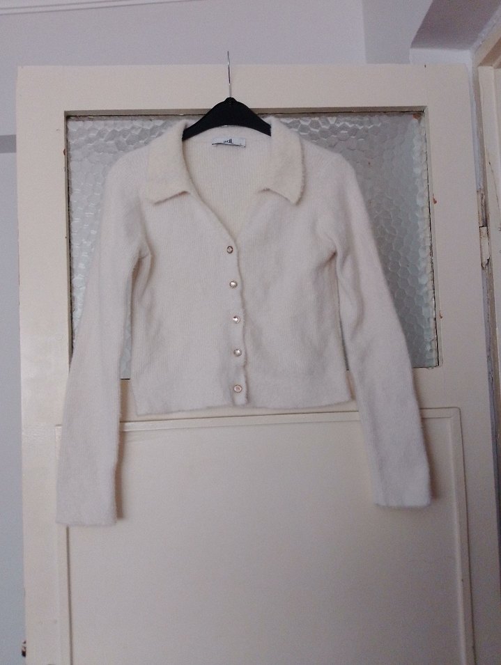 M beden Düğmeli beyaz triko hırka, uzun kollu ve yakalıdır. İnce kesimi ve midi boyu ile rahat ve şık bir seçenek sunar.