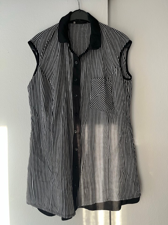 Adil ışık Kolsuz, düğmeli, yakalı kadın gömlek. Siyah ve beyaz çizgili 42 beden