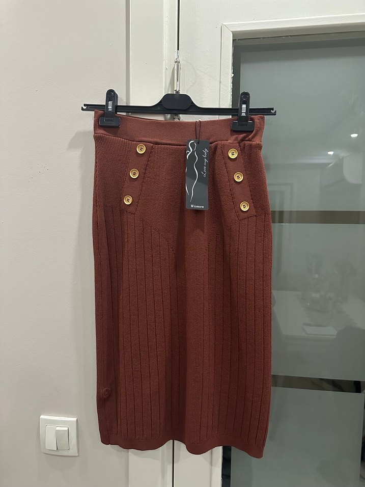 Düğmeli detaylara sahip kahverengi uzun triko etek, modern klasik tarzda hoş ve rahat bir görünüm sunar.