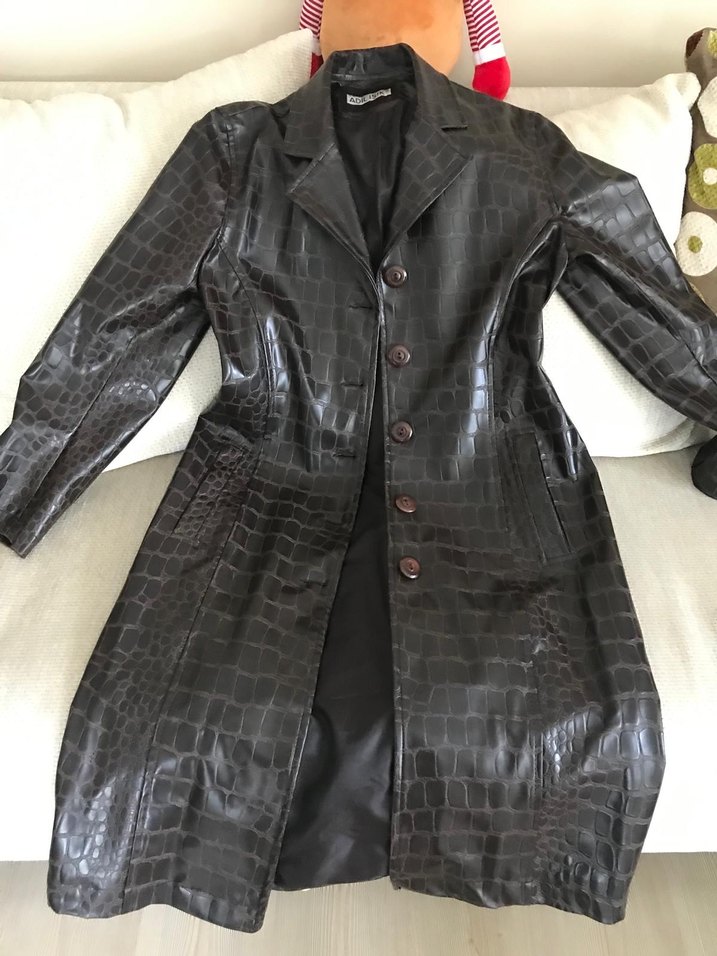 Düğmeli, fitted kesim uzun deri ceket, koyu kahverengi timsah desenli, kesik yaka, Adil Işık Marka M beden düğmeli trençkot