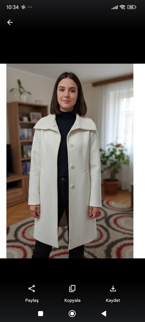 Kürk detaylı beyaz midi kaban, uzun kollu ve yakalıdır. Yumuşak ve sıcak kumaştan üretilmiş, ofis için uygun sade tasarıma sahiptir. Sıfırı 8000 civarı, beden olmadığı için satılık, uygun fiyata kaçmaz