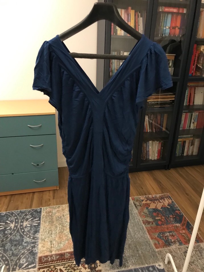 Lacivert midi elbise, drapeli detaylarla V yakalı ve kısa kollu. Şık ve modern kesimiyle romantik akşamlar için ideal.