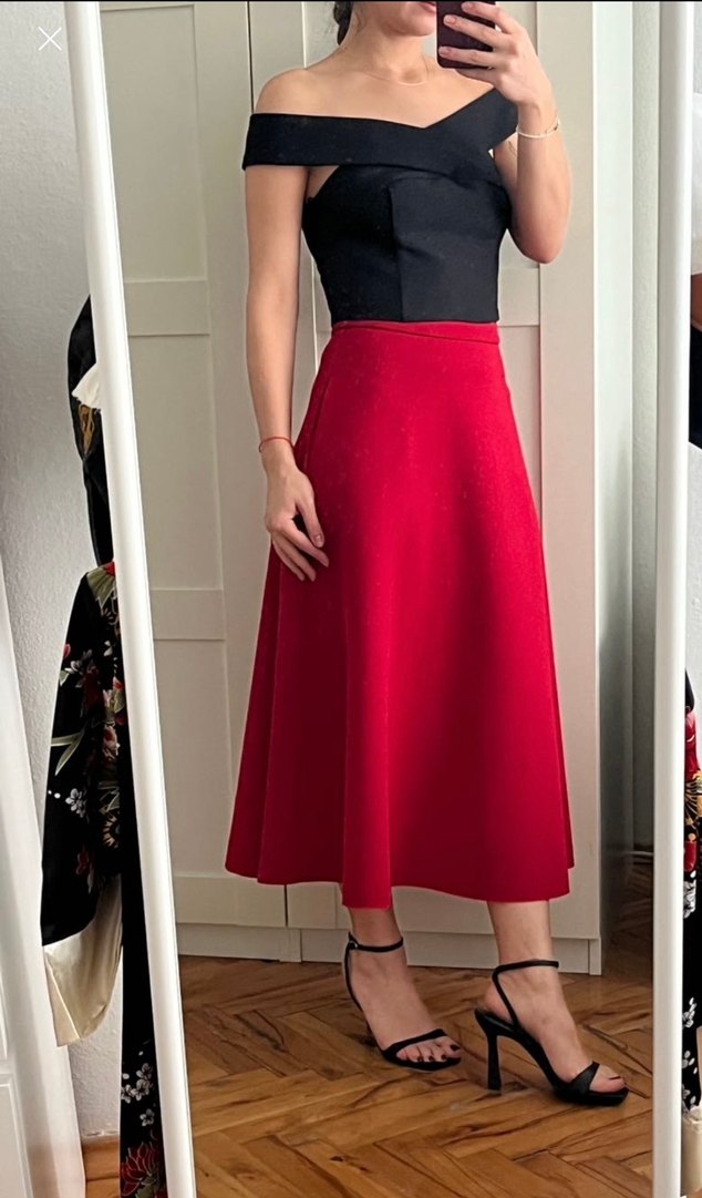 AdL Night Zoom Kırmızı midi etek, çağdaş ve zahmetsiz şıklık sunar, ofis için idealdir. 1 defa giydim. Üstündekiyle takım olacak şekilde totalde indirim yapabilirim. #adl #nightzoom