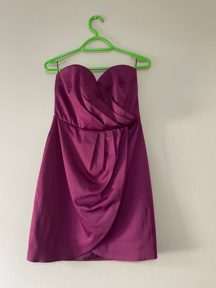 Mor renkli, straplez ve drapeli tasarıma sahip, midi boy ve vücuda oturan abiye elbise. Minimalist ve çağdaş tarzda, romantik akşamlar için ideal.