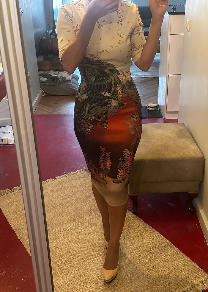 Özel tasarım serisinden dalgıç kumaş dijital baskı tok kalınlığı var, iç göstermez. Üste oturan kalem elbise. Esnek olduğu için hareket kısıtlaması yok çok rahattır