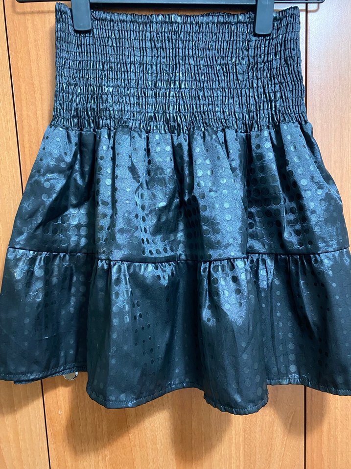 Parlak siyah sentetik kumaştan, puantiye desenli ve fırfırlı detaylara sahip, midi etek. Romantik akşamlar için uygun. ✨ XS yazıyor ama M bedene kadar oluyor.