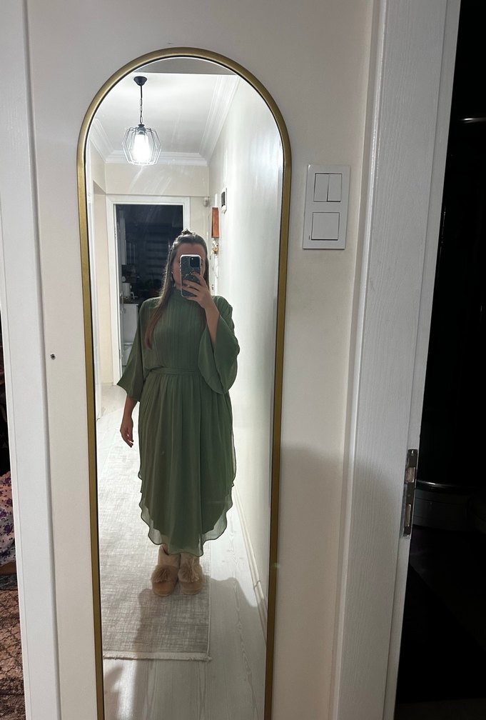 Şeffaf detaya sahip haki uzun elbise, yüksek yaka ve uzun kolludur. XL etiketi var ama L beden ile uyumlu. 163 cm boy 70 kg ile giyildi