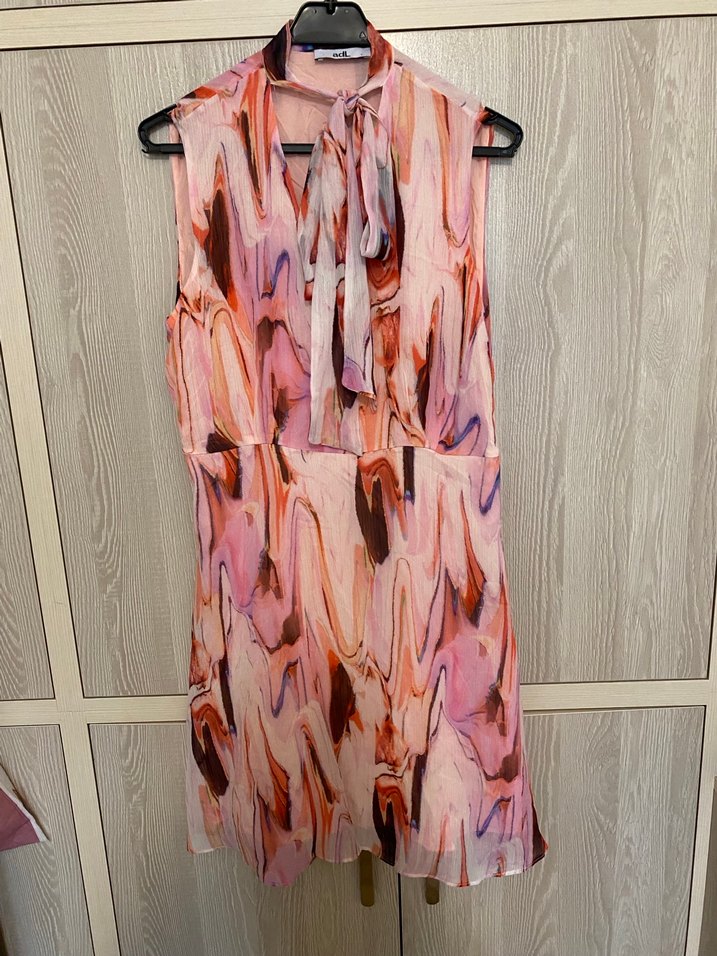 İhtiyaç fazlası, iki kol altı arası 48 ve boy 92 cm. Kolsuz, fularlı halter yakalı. Yandan fermuarlı ve astarlı