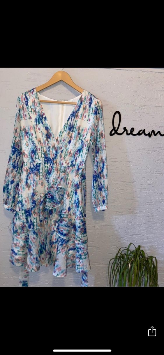 Uzun, bol kesim bohem elbise çok renkli hafif batik desenli ve drapeli tasarıma sahiptir. Uzun kollu ve V yaka, yumuşak sentetik kumaştan üretilmiştir.