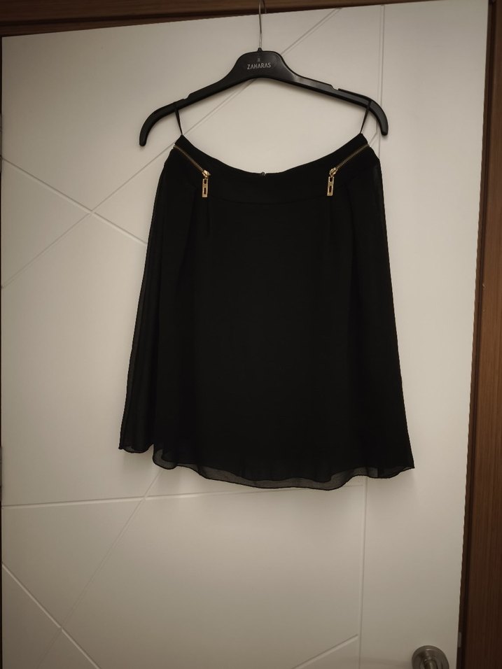 dışı tül şifon içi astarlı.boyu 50 cm. tam diz üstü. kiloş bir model. iş yerinde veya özel günlerde kullanıma uygun. s bedende rahatlıkla giyer bol kalıp. bir iki kere giydim yeni gibi sorunsuz.
